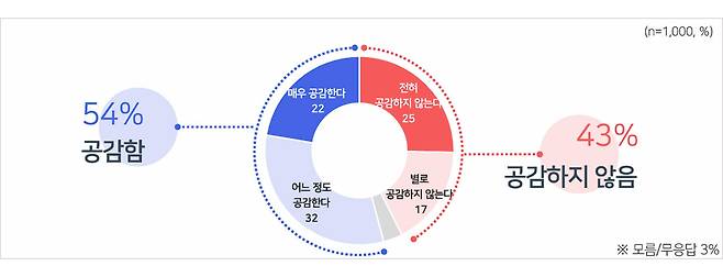 지난달 이재명 대통령이 유엔총회 기조연설에서 '흡수통일은 없다, 북한 체제를 존중한다'는 입장을 밝힌 것에 대해선, '공감한다'는 54%, '공감하지 않는다' 43%로 나타났습니다.