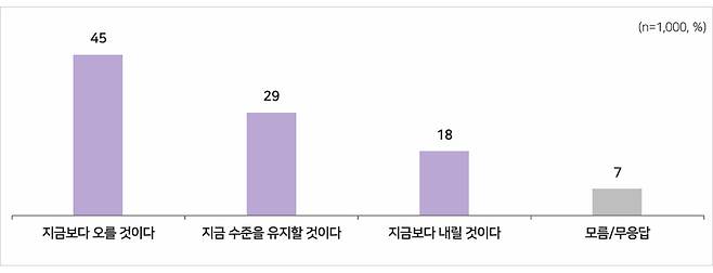 향후 1년 동안 부동산과 주식 시장이 어떻게 될 것으로 전망하느냐는 질문엔, 부동산에 대해선 응답자 45%가 상승을 예측했고, 주식에 대해선 42%가 오를 것이라고 내다봤습니다.