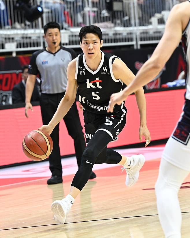 KT는 문정현(194cm, F)과 하윤기(204cm, C) 등 국내 선수의 높이를 앞세워 페인트 존을 사수했다. 그리고 카굴랑안은 돌파와 속공으로 연속 4득점을 더했다. 힉스도 단독 속공으로 득점에 가세했다. KT는 40-29, 두 자릿수 차로 달아났다.