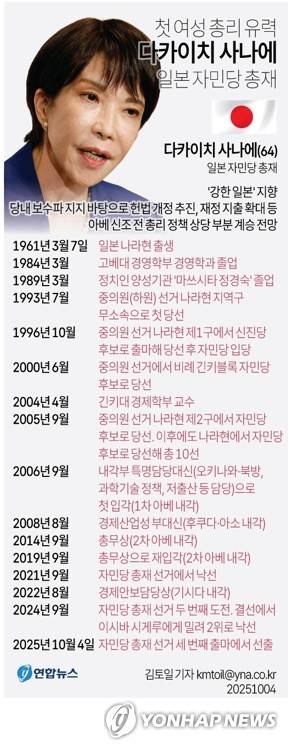 (서울=연합뉴스) 김토일 기자 = 일본 첫 여성 총리 자리를 사실상 예약한 다카이치 사나에 집권 자민당 신임 총재는 '강한 일본'을 지향하면서 적극적인 안보·경제 정책을 펼 것으로 전망된다.