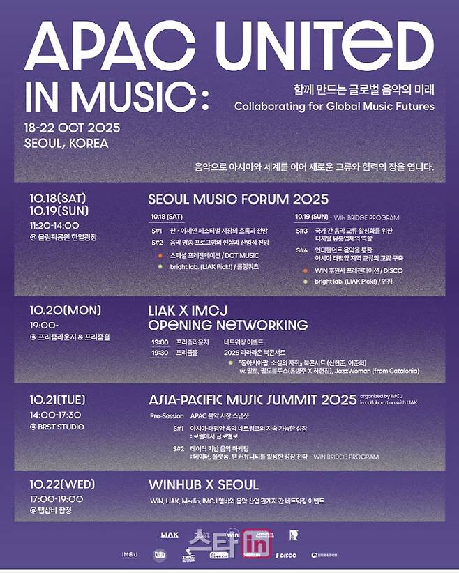 ‘APAC 유나이티드 인 뮤직’ 기간에는 △서울뮤직포럼 △오프닝 네트워킹 이벤트 △아시아 퍼시픽 뮤직 서밋 △윈허브 네트워킹 세션 등이 진행된다.