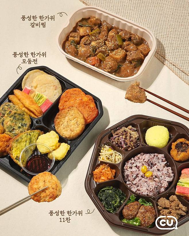 CU '한가위 11찬 도시락'도 주목할 만합니다. 특제 소스로 구워낸 떡갈비에 표고버섯전, 부추전 등 전 4종과 나물, 떡 등이 더해져 한눈에 봐도 풍성한 구성이 돋보입니다. 이외에도 세븐일레븐은 '오색찬란풍성한상도시락'을, 이마트24는 '추석명절큰집'과 '추석보름달한판' 등을 선보여 선택지를 넓혔습니다.