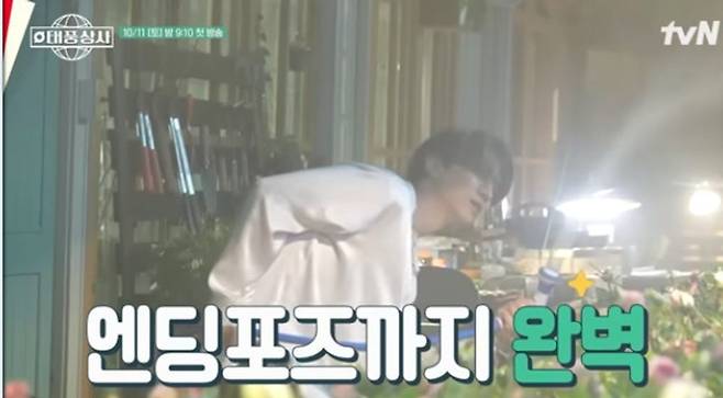 이어 온실에서 90년대 댄스 음악에 맞춰 화초에 물을 주는 동시에 흥 폭발 댄스를 펼치는 태풍 역 이준호의 촬영 모습이 공개됐다.