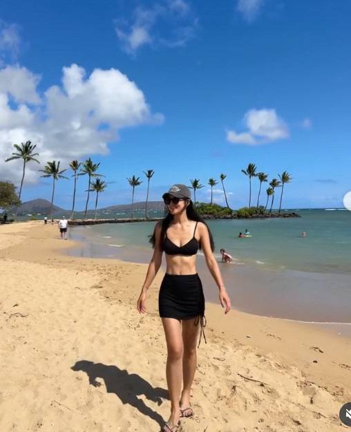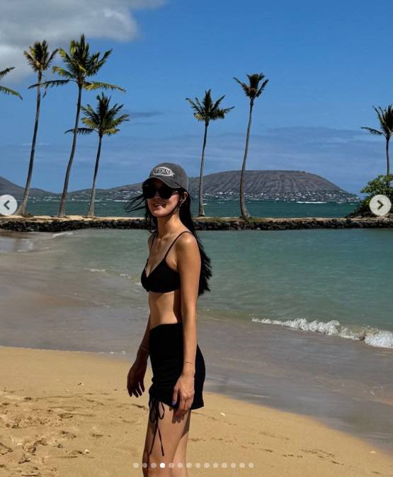 공개된 사진 속 김성은은 푸른 바다와 야자수 배경의 해변에서 블랙 비키니 톱과 스커트를 입고 늘씬한 몸매를 뽐내며 산책하고 있다.