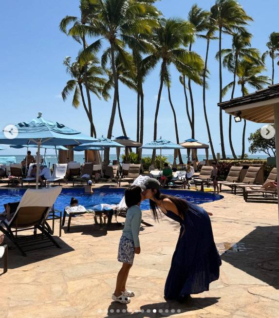 또 다른 사진에서는 풀사이드에서 딸과 다정하게 입맞춤하는 장면이 담겨, 가족과 함께하는 따뜻한 일상도 전했다.