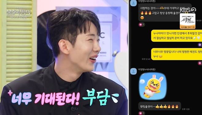 조권은 이정현과의 개인적인 친분에 관해 "알고 지낸 지 오래됐다. 결혼하시기 전에 친구들과 홈파티할 때도 초대받아서 거실에서 '와'도 추었다. 볼륨 줄이고"라고 말해 웃음을 안겼다. 조권은 이정현에게 직접 연락을 받았냐는 말에 "출연진 기사가 먼저 나서 정말 오랜만에 3~4일 전에 연락이 왔다. 너무 기대된다고 하시더라. 그래서 부담됐다. '차라리 연락 주지 마시지'란 생각이 들 정도로"라면서도 "너무 응원하고 오랜만에 봐서 좋단 얘기 해주셨다"라며 응원받았다고 전했다.