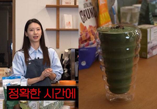영상에서 김진경은 변비 완화에 도움 되는 '스피루리나 그린 스무디' 레시피를 공개했다.