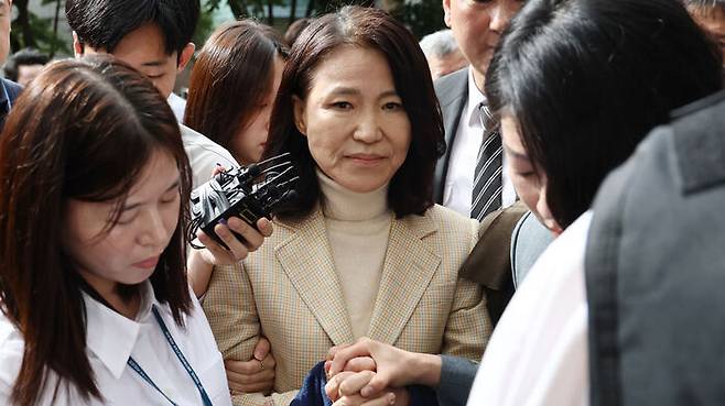 ▲ 이진숙 전 방송통신위원장이 4일 오후 체포적부심사를 받기 위해 서울남부지법으로 출석하며 국민의힘 배현진 의원과 손을 잡고 있다.