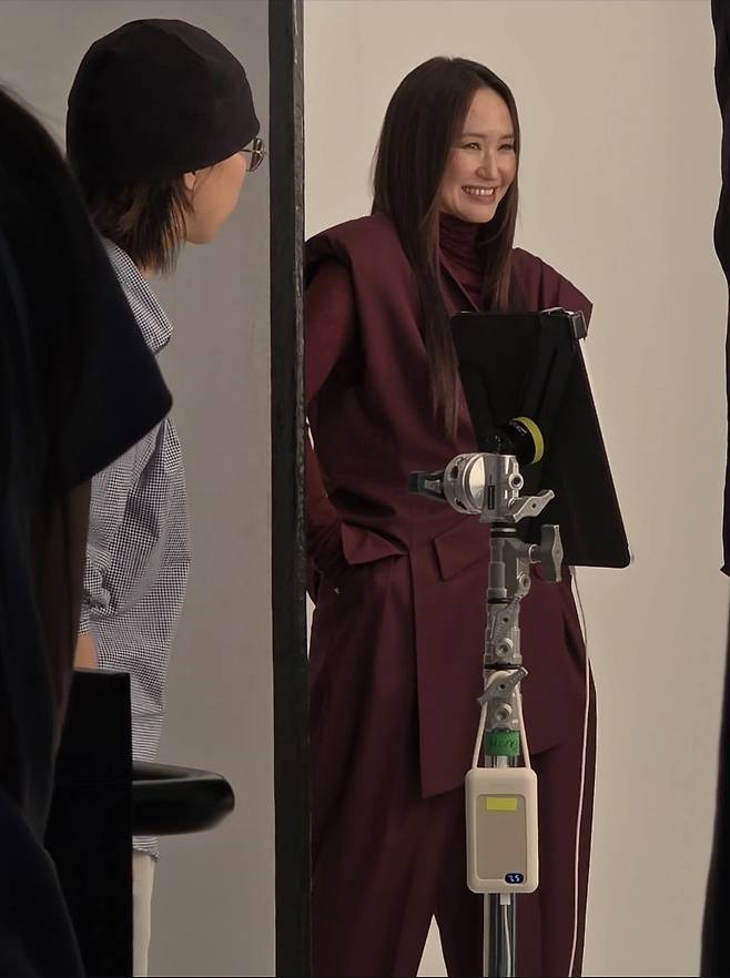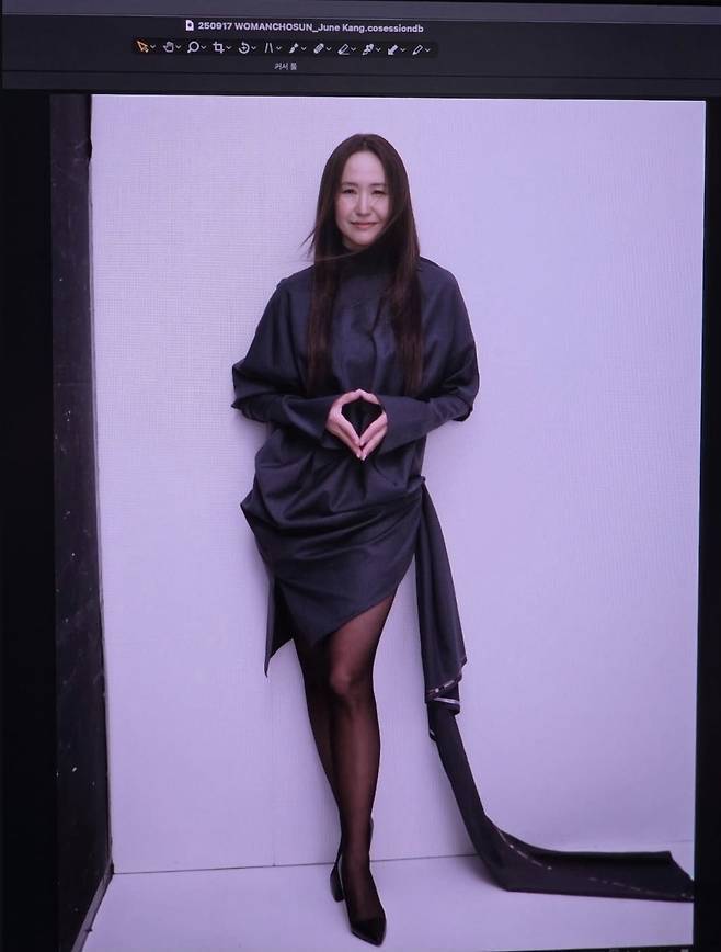 풍성하게 떨어지는 볼륨감이 얼굴선을 부드럽게 감싸고, 앞머리 없이 시원하게 드러난 이마 라인이 그녀의 당당한 이미지를 배가시켰다.