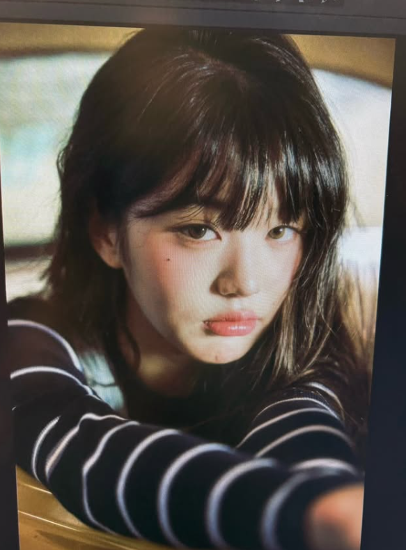 장원영 특유의 상큼한 표정과 더불어 도자기 인형같은 매끈한 피부, 아기자기한 이목구비가 사랑스러움을 더한다.