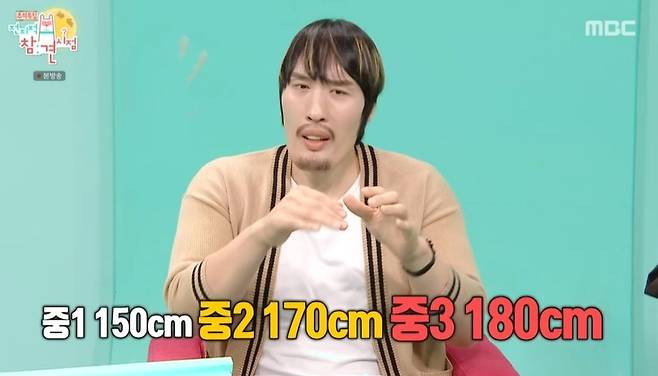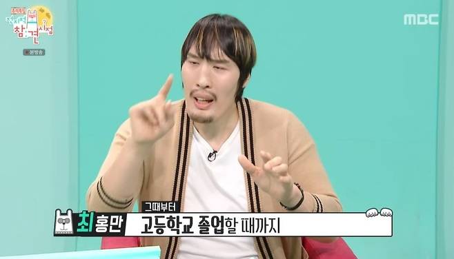 중학교 시절 맨 앞자리에 앉았다는 최홍만은 "태어날 땐 4.6kg이었다. 초등학교 땐 별명이 '좁쌀, 콩만이'였다. 친구들보다 유난히 키가 작았다"라며 어린 시절 사진을 공개했다. 최홍만은 "그러다 중1 때 150cm, 중2 때 170cm, 중3 때 180cm이었다. 그때부터 고등학교 졸업할 때까지 한 달에 1cm씩 콩나물 자라듯이 컸다"라며 "보통 교복을 1년에 한두 번 맞추지 않냐. 전 10번 이상 맞췄다"라고 고백했다. 그러자 양세형은 "1년에 한두 번? 난 3년 내내 다 입었는데?"라고 의아해했다.