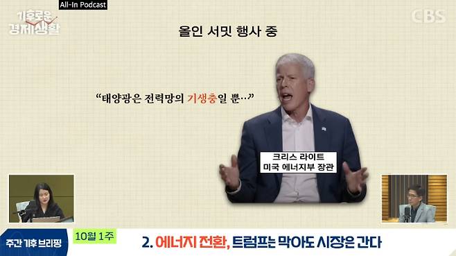 ◇ 최서윤> 에너지부 장관인 크리스 라이트가 여기에 앞장서는 인물이에요. 예전에도 다뤘는데 프래킹 기업인 리버티 에너지의 CEO 출신이고 기후위기 부정론자입니다. 이분도 기조가 그대로예요. 얼마 전에 한 행사에서 태양광 패널이 전력망의 기생충이고 지구 전체를 다 덮는다고 해도 전력을 공급할 수 없다고 말했다고 해요. 심지어 기후변화를 부정하려고 비주류 연구자들을 모아서 보고서를 쓰면서, 기후변화는 재앙이 아니라 도전이라고 주장했어요. 그래서 폴리티코가 이 주장을 검증하고 반박하는 기사들을 썼는데요. 굳이 이걸 소개하느라 시간을 할애할 필요는 없을 것 같습니다.