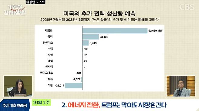 ◇ 최서윤> 지금 화면에 그래프를 하나 띄워드리는데요. 연방 에너지 규제 기관, 즉 정부의 예상치예요. 올해 7월부터 2028년 6월까지 미국의 전력 생산에서 순증감량 예상치를 보여주는 건데요. 보시면 태양광이 가장 많고 풍력이 그 뒤를 이어요. 그리고 석탄이랑 석유는 줄어드는 걸로 나타나 있습니다. 어떻게 보면 트럼프 대통령의 임기 내내 재생에너지는 계속 늘어나겠다는 거죠.