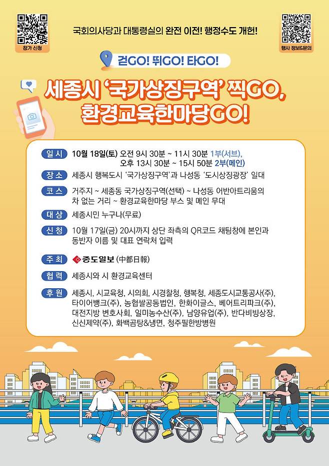 중도일보는 오는 10월 18일 세종시 행복도시 일대에서 '걷GO! 뛰GO! 타GO! 세종시 '국가상징구역' 찍GO 한바퀴' 행사를 진행한다. 기후에너지환경부와 세종시가 공동 주최하고, 시 환경교육센터가 주관하는 '차 없는 거리에서 GREEN 세종 환경교육 한마당'과 연계한 대중교통 4종 이벤트다.