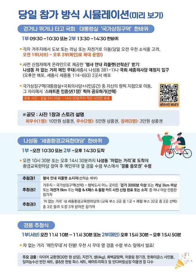 당일 참가 방식은 단순하다. 18일 토요일 오전 9시 30분 전·후 자신의 거주지를 출발해 ▲나성동 차 없는 거리 내 '중앙무대' 앞 중도일보 부스 (세종시 나성동 381-1) 또는 ▲국회 세종의사당 예정지 입구(세종시 세종동 114-693)로 향하면 된다. 여기서 행사 안내 '리플렛(경품 응모권 1장 수령 기회)'을 받을 수 있다. 버스를 타고 걸어서 또는 러닝으로 이동해도 좋고, 자전거 투어에 나서도 괜찮다