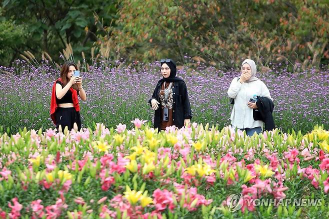 (인제=연합뉴스) 지난 4일 강원 인제군 북면 용대관광지 일원에서 열린 '인제 가을꽃축제'에서 외국인 관광객들이 꽃길을 거닐며 추억을 쌓고 있다.