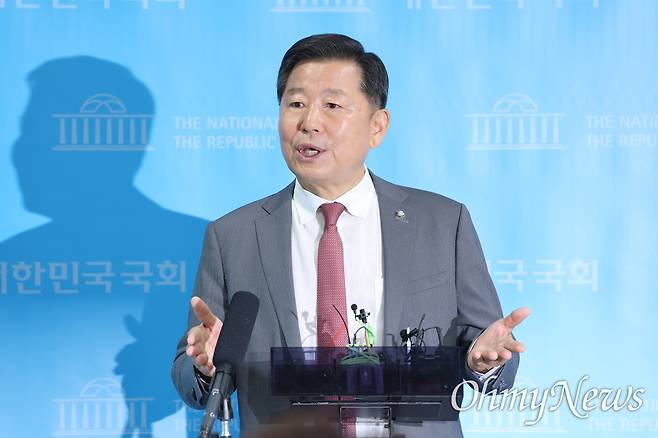 | ▲ 2025년 7월 22일, 이철규 국민의힘 의원이 서울 여의도 국회 소통관에서 순직해병 특검 수사 관련 입장을 밝힌 뒤 취재진 질문에 답하고 있다. |