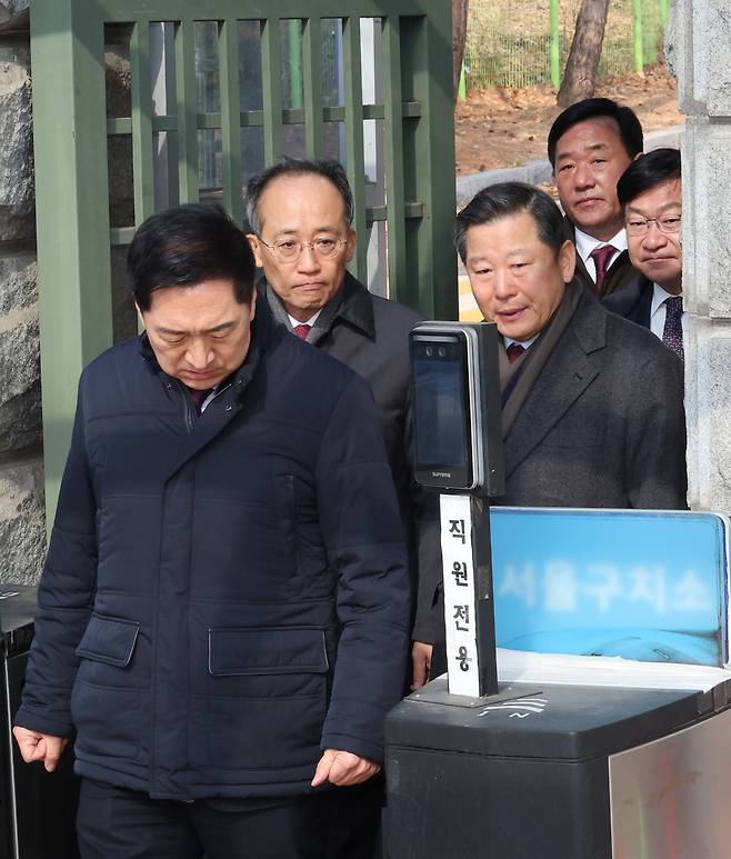 | ▲ 2025년 2월 10일, 국민의힘 의원들이 경기도 의왕시 서울구치소에서 윤석열 대통령 면회를 마친 뒤 츨구로 나오고있다. 앞부터 김기현 전 대표, 추경호 전 원내대표, 이철규, 정점식, 박성민 의원. |