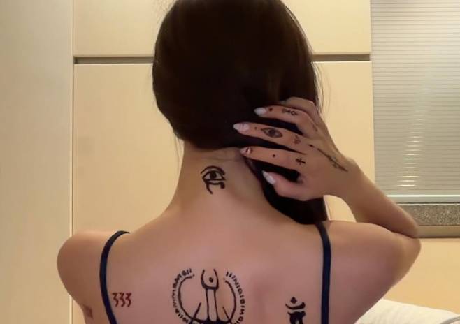 지젤은 2일 자신의 인스타그램을 통해 상의를 탈의한 채 찍은 뒤태 사진을 여러장 공개했다. 파격적인 탈의보다 눈길을 더욱 끄는 건 화려한 문신. 목 뒤와 등, 손가락 등에 컬러풀한 문신이 가득 새겨져 있어 놀라움을 자아냈다. 지젤은 실제 문신이 아니라 멤버 닝닝과 함께 헤나를 한 것으로 알려졌다.