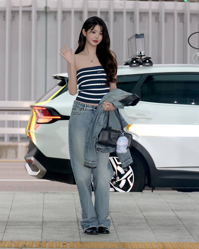 장원영은 스트라이프 튜브 톱에 라이트 블루 컬러의 데님 블루종 재킷, 클래식 핏 데님 팬츠를 매치해 유니크한 셋업 룩을 완성했다. 브러쉬드 가죽 로퍼와 가죽 보 백으로 캐주얼하면서도 고급스러운 무드를 더했고, 메탈 목걸이로 포인트를 줬다.