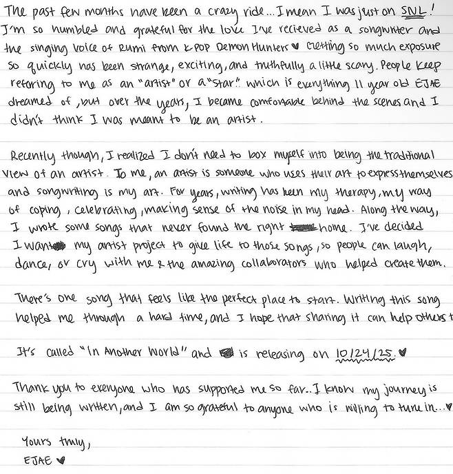 그는 "작곡가로서, '케데헌'의 루미의 노래 목소리로서 받은 사랑에 진심으로 감사한 마음"이라며 "11살 때 꿈꿨던 모든 것들 이루고 있다"고 말했다.