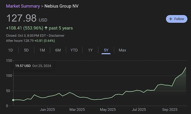 5일 나스닥시장에 따르면 지난 4일 네비우스 주가는 전 거래일 대비 1.68% 오른 127.98달러에 마감했다.