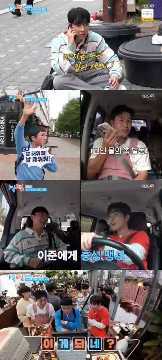 이준은 지금 조세호와 둘이 있는 상태라고 했다. 딘딘은 "내가 차 문 열면 형이 007처럼 뛰어와서 타는 거다"라고 배신 사인을 보냈다.