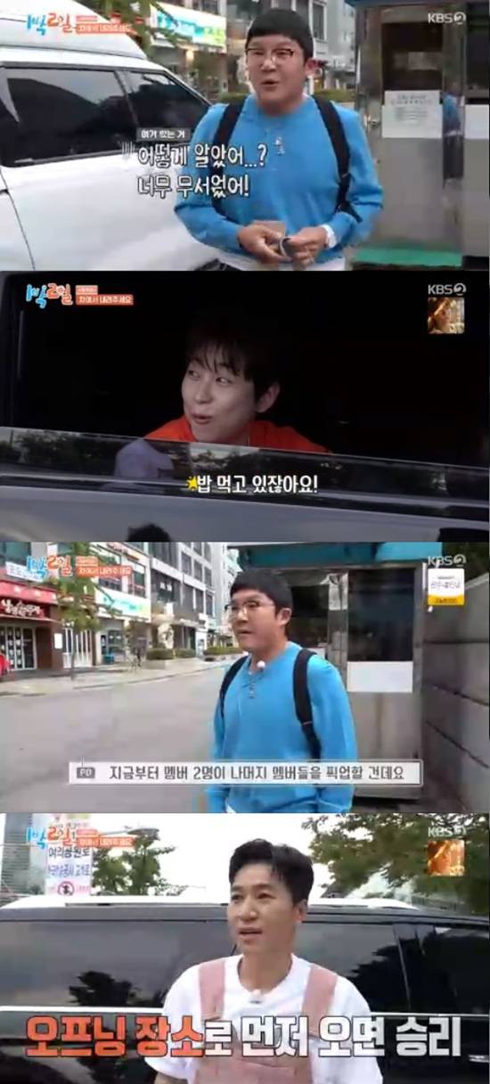 제작진은 멤버들에게 "멤버 2명이 픽업하러 올 거다. 3명이 되어서 오프닝 장소로 먼저 오면 승리다. 대중교통은 이용할 수 없다"고 말했다.