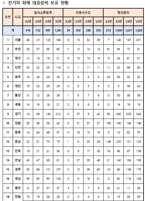 특히 ‘질식소화덮개’와 ‘방사장치’ 같은 전기차 전용 진화장비의 편차가 크다. ‘질식소화덮개’의 경우 경기(212개), 경북(187개), 서울(166개), 인천(118개) 순으로 많았으나 대전(29개), 광주(28개)는 30개에도 못 미쳤다.