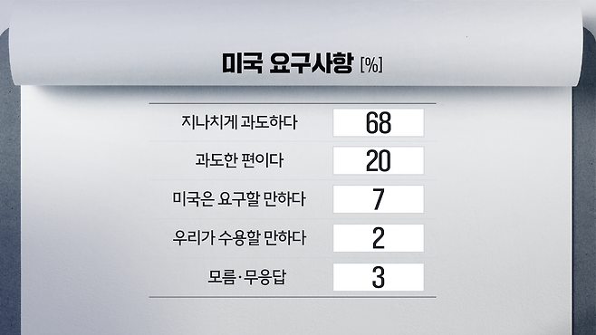 '지나치게 과도하다' 68%, '과도한 편이다' 20%로 10명 중 9명가량은 미국 요구가 과도하다고 답했습니다.