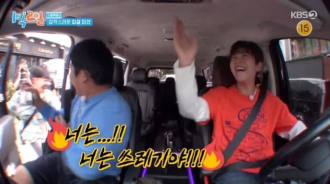 이준은 딘딘의 차량을 보자마자 전속력으로 뛰어갔지만, 문이 바로 열리지 않아 당황했다. 이 틈을 놓치지 않고 조세호는 전력질주해 가까스로 조수석에 탑승했다. 조세호는 자신을 버리려던 이준을 향해 "너는 쓰레기야!"라고 분노해 폭소를 유발했다.
