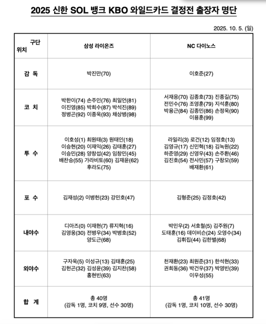 NC와 삼성은 1차전을 하루 앞둔 5일 경기에 나설 30인 엔트리를 발표했다. NC는 라일리 톰슨, 로건 앨런, 구창모를 비롯해 투수 13명, 포수 2명, 내야수 8명, 외야수 7명으로 30인을 구성했고, 삼성은 원태인, 아리엘 후라도, 헤르손 가라비토 포함 투수 13명, 포수 3명, 내야수 7명, 외야수 7명 등 30인을 발표했다. 홈런왕 르윈 디아즈(삼성)와 지난해 홈런왕이자 홈런 2위 맷 데이비슨(NC)도 명단에 이름을 올렸다.