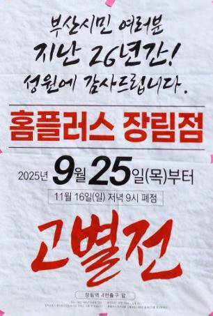 이러한 가운데 홈플러스 장림점은 지난달 25일부터 재고를 처리하기 위해 대폭 할인하는 고별전을 운영 중이다. 이번 행사는 다음 달 16일 폐점일까지 이어진다고 공지됐다.
