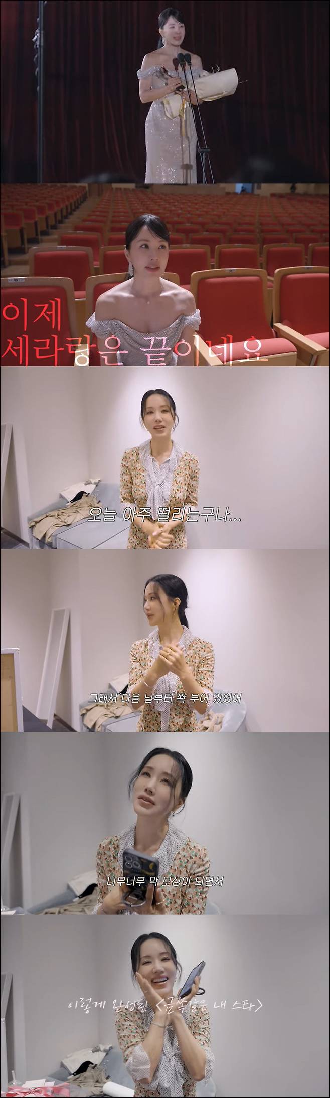 시상식 장면을 마지막으로 촬영을 끝낸 엄정화. 엄정화는 촬영을 끝난 심경에 대해 "섭섭하다. '닥터 차정숙' 때는 엄청 울었고 '금쪽같은 내스타'는 울지 않은 거 같다. 근데 되게 행복했다. 배우의 이야기이기도 하고 그래서 좋았던 거 같다"고 밝혔다.