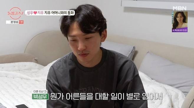 그러면서 성우는 자신의 가정사를 털어놓았다. 성우는 "저희 부모님이 제가 고등학생 때 이혼하셨다. 보통 남자들이 아버지를 멘토로 생각하는데 그 부분이 부족한 거 같다. 장인어른이 봤을 때 제가 어떤 모습일까 걱정이 된다"라고 속내를 밝혔다.