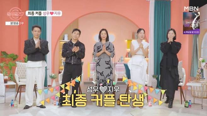 박성우, 한지우의 선택 만이 남은 상태. 성우는 지우를 향해 망설임 없이 돌아섰고, 지우 역시 그를 향해 안기며 최종 커플이 됐다. MC들은 "이 커플은 진짜 재혼할 거 같다"라며 뜨겁게 축하했다.