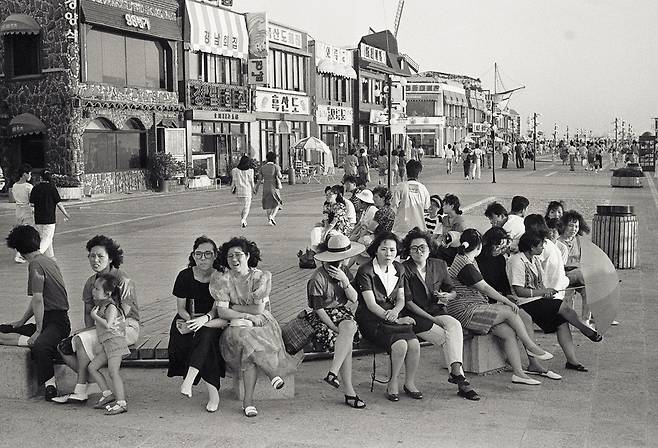 다른 지역에서 온 듯한 차림새 여성들은 바닷바람 맞으며 담소를 나누고 있다.