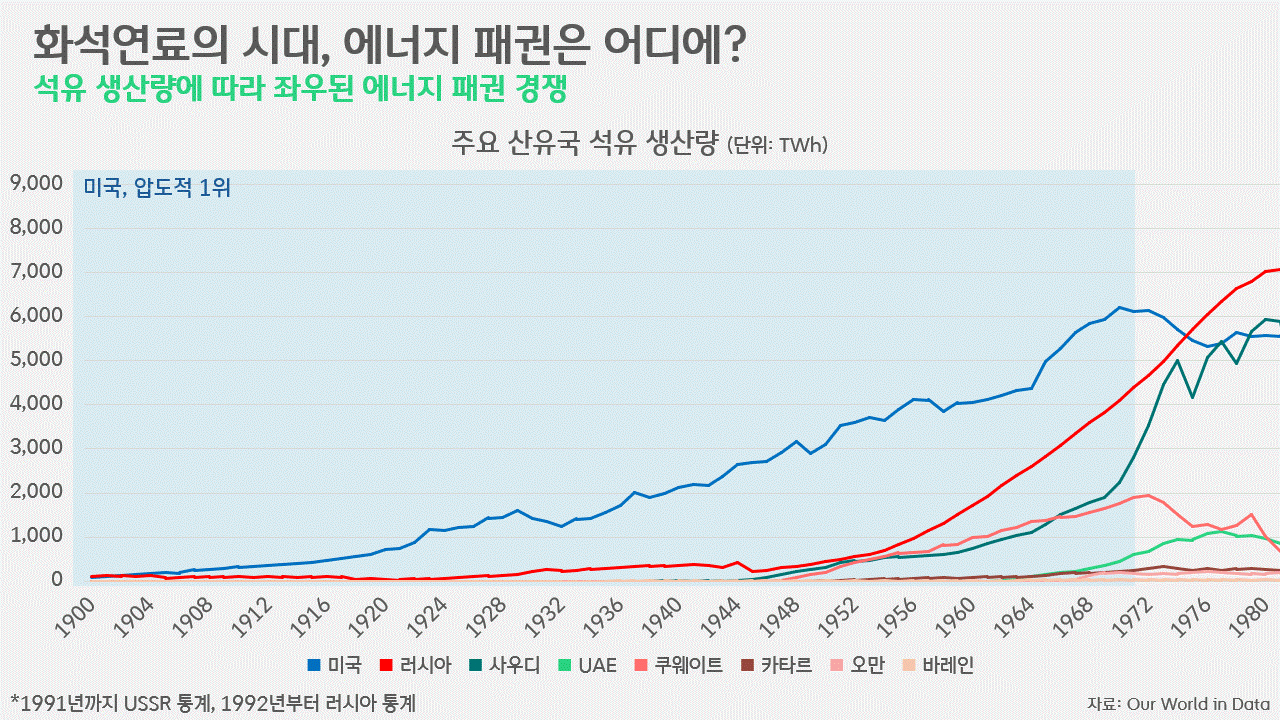 미국과 소련의 냉전은 1945년부터 시작됐습니다. 공교롭게 러시아의 석유 생산량이 급증하기 시작한 때 역시 그즈음입니다. 그리고 소련은 1975년, 5,708TWh의 석유를 생산하며 당시 미국의 생산량(5,463TWh)을 넘어서기에 이르렀죠. 석유는 소련이 냉전을 지속할 수 있었던 든든한 배경이 됐습니다. 이후 소련은 미국보다 석유 생산량에 있어 우위를 점했습니다. 그리고 공교롭게도 두 국가 사이에 다시금 석유 생산량이 역전된 것은 1992년, 소련이 붕괴한 때였습니다. 러시아의 생산량(4,638TWh)이 미국(4,804TWh)보다 적어진 겁니다. 그리고 블라디미르 푸틴이 러시아를 이끌기 시작한 1999년부터 러시아는 다시 석유 생산량을 크게 늘려 2001년 대미(對美) 우위를 되찾았고요.