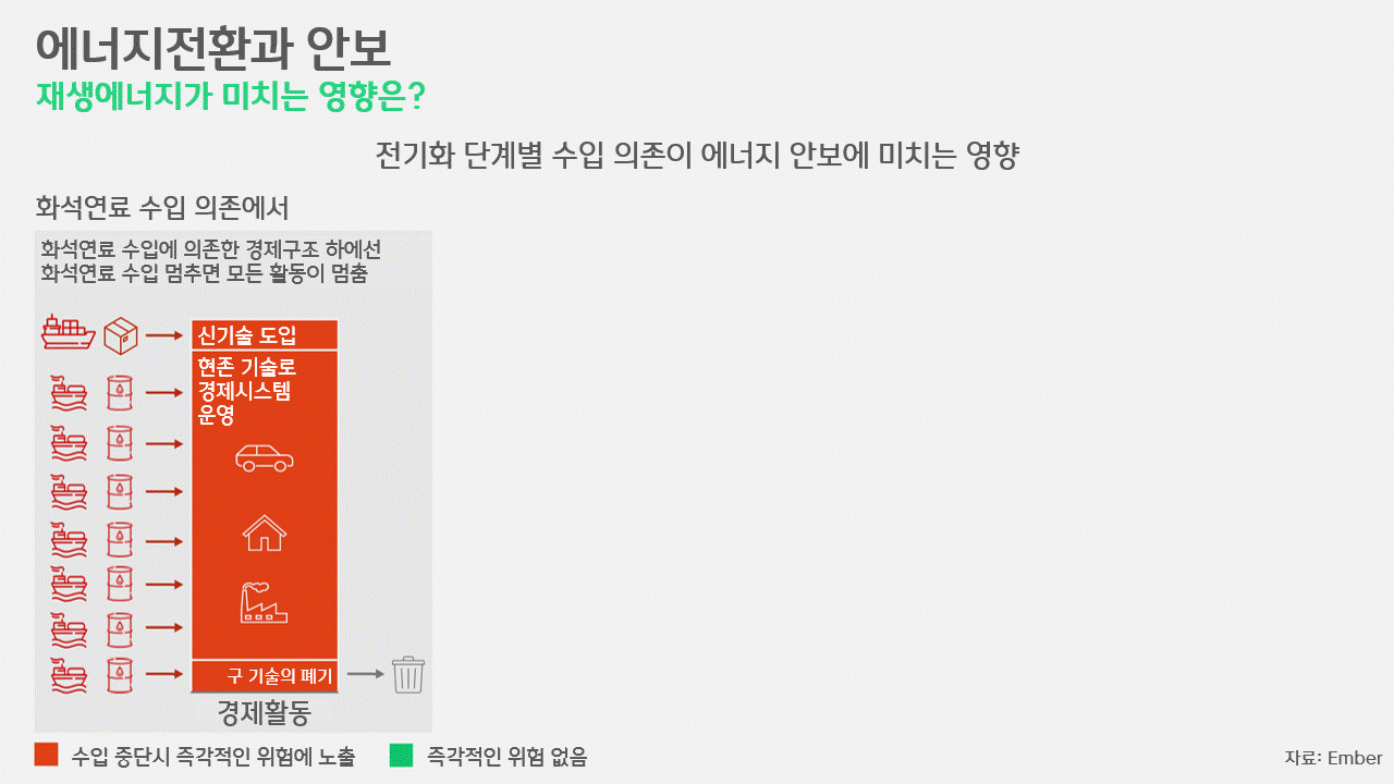 화석연료 기반의 경제 시스템을 전기화 중심으로 전환하면 어떻게 될까. 설사 전기화 기술을 해외에 의존한다 하더라도, 그 기술의 도입 이후 이를 기반으로 경제활동을 하는 기간 동안은 외부성의 영향으로부터 상대적으로 자유로울 수 있습니다. 에너지원 자체는 자국 내에서 조달이 가능한 덕분입니다. 물론, 이런 신기술의 도입부터 국산화가 가능하다면, 그때부턴 완전한 에너지 독립이라는 선순환에 접어들 수도 있습니다. 유가가 어떻게 출렁이든, 에너지를 두고 국제적 분쟁이 관세나 환율 전쟁을 넘어 실제 물리적인 전쟁으로 이어진다 하더라도, 자국 내 경제활동에서의 에너지 사용은 안전할 수 있는 것이죠.