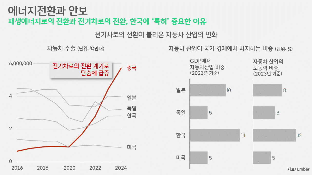 이런 상황에서 한국이 ICE에 더욱 몰두해 일본과 독일의 엔진과 경쟁을 하는 것이 효율적일까요? 아니면 중국과 함께 글로벌 BEV 전환을 더욱 가속화해 새로운 시장에서 일본과 독일을 '왕년의 강호'로 눌러두는 것이 효율적일까요? 우리는 이제 '선택의 기로'에 놓였습니다. 우리나라의 GDP에서 자동차 산업이 차지하는 비중은 무려 14%에 달합니다. 한국보다 자동차 수출량이 많은 일본(자동차 산업의 GDP 비중 10%)이나 독일(자동차 산업의 GDP 비중 5%)보다도 자동차 산업의 역할이 훨씬 큽니다. 국가 내 모든 노동력 가운데 자동차 산업에 종사하는 이들의 비중 또한 한국은 12%로 일본(8%)이나 독일(6%)보다도 더 많습니다. 이 선택의 기로에서 어떤 선택을 하냐에 따라, 그리고, 그 선택을 얼마나 신속하게 하냐에 따라, GDP도 일자리도 좌지우지되는 것이죠.