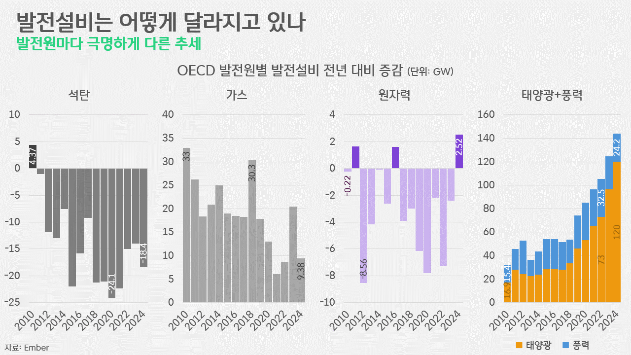 태양광과 풍력의 경우, 전통적인 3가지 주력 발전원과는 '전혀 다른 보법'을 보였습니다. 당장 연간 증감 폭 자체가 이들 발전원과는 달랐습니다. 그래프 y축의 숫자를 보더라도, 자릿수 자체부터 비교가 불가할 정돕니다. 더불어, 해마다 '꾸준한 증가세'를 보이는 것을 넘어 해마다 추가되는 설비용량은 시간이 흐를수록 더욱 커지고 있죠. 2010년, 전년 대비 태양광발전설비는 16.9GW, 풍력발전설비는 15.4GW 증가했습니다. 그런데, 2024년엔 전년 대비 태양광은 120GW, 풍력은 24.2GW 더 추가됐습니다. 그 결과, OECD 회원국의 태양광 및 풍력발전설비 용량은 2010년 174GW에서 2024년 1,195GW로 거의 7배가 됐습니다.