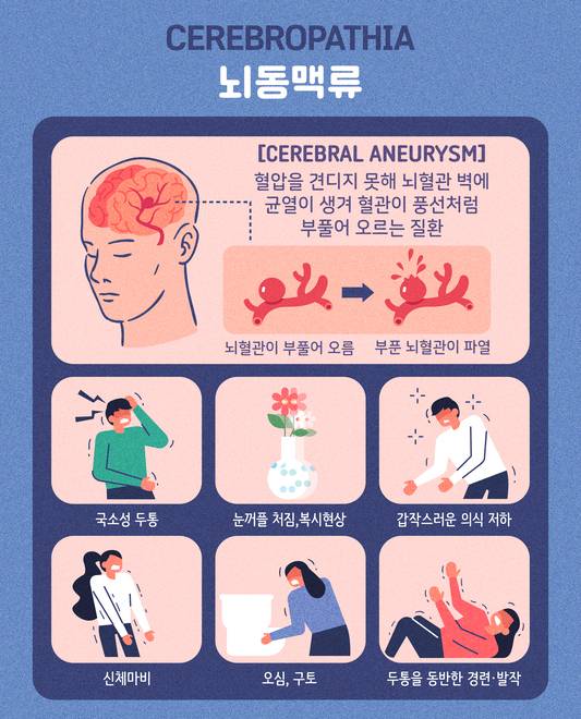 뇌동맥류가 위험한 건 파열되기 전 대부분이 '무증상'이라는 점 때문이다. 일단 파열되고 나서야 '한 번도 경험하지 못한 두통' '벼락이 친 것 같은 통증' 등을 경험한다. 시야 이상이나 시력 저하, 감각저하, 어지럼증, 두통 등 압박 부위에 따라 다양한 신경학적 증상이 나타날 수 있다.