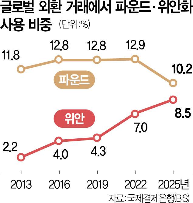런던 증시가 활력을 잃은 가운데 외환시장에서 파운드화 위상도 예전과 같지 않은 모습이다. 국제결제은행(BIS)에 따르면 올해 4월 기준 세계 외환 거래에서 파운드화의 점유율은 10.2%로 2022년 12.9%에서 하락했다. 반면 중국 위안화는 7.0%에서 8.5%로 상승하며 양국 통화 간 격차는 불과 1.7%포인트까지 좁혀졌다.