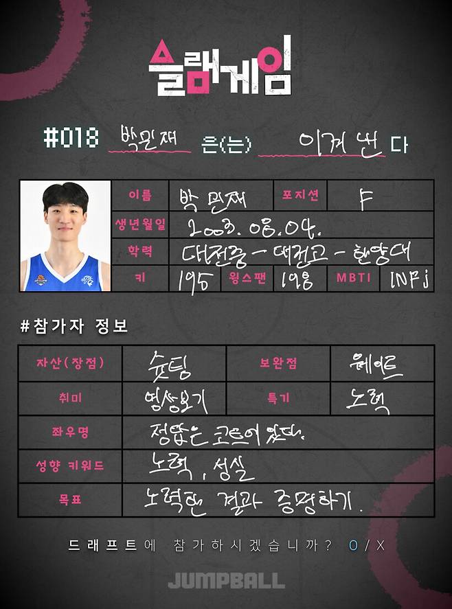 누구나 행복한 상상이라는 것을 해본 적 있지 않나. KBL 일원이 되고 싶은 꿈을 가진 드래프트 참가자들은 저마다 한 번씩 “내가 프로 선수라면?”이라는 행복한 상상을 해봤을 것이다. 그래서 물었다. 프로 선수가 된 당신은 어떤 플레이를 펼치고 팬들과 동료들에게 어떤 칭호를 받는 선수가 되어있을 것 같은지에 대해 말이다. 박민재는 ‘분위기를 가져오는 선수’라는 대답을 전했다.