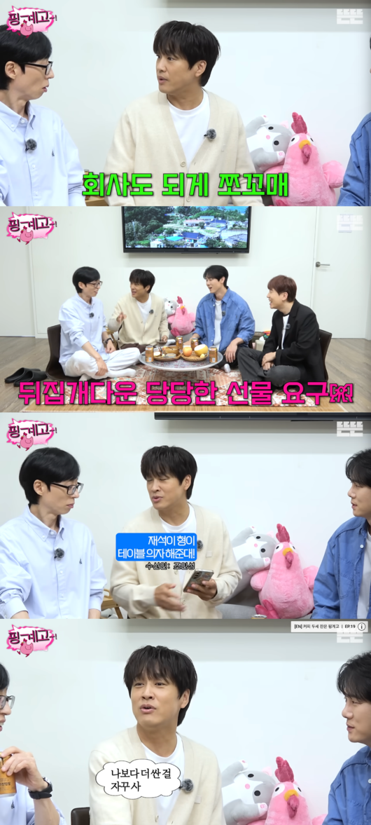 이어 차태현은 “형은 테이블 작은 게 있다. 거기에 의자 4개가 있다. 4개를 사달라”고 부탁했다. 유재석은 “알겠다. 해줄 수 있다”고 받아들였고, 유연석은 “저는 거기서 심으면 안되냐”고 물었다. 차태현은 “아니다. 너는 데스크 의자”라고 했고, 유연석은 “안 된다. 비싸요 그거”라고 거절했다.