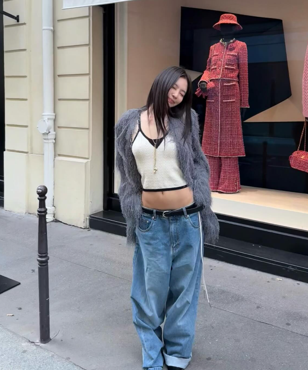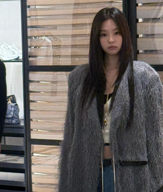 사진 속 제니는 골반 라인이 드러나도록 내려입은 청바지에 크롭 민소매, 회색의 재킷을 매칭하며 힙한 패션을 완성했다.
