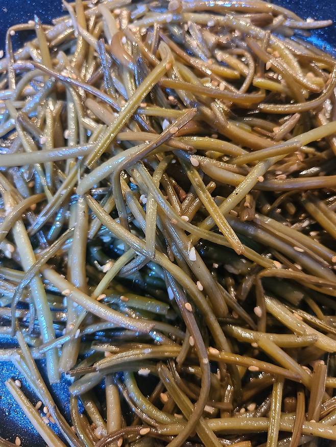 | ▲ 얼핏 보면 고사리 나물 같다. 아삭한 식감이 일품인 영양가 높은 건강식, 고구마순 나물 볶음이다. |