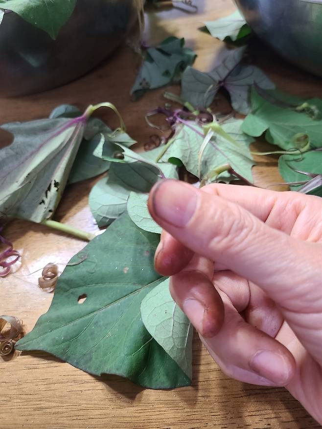 | ▲ 껍질 벗긴 말간 고구마순이 쌓여 갈수록 손톱 밑이 까매지고 손가락이 거칠게 물들어 간다. |