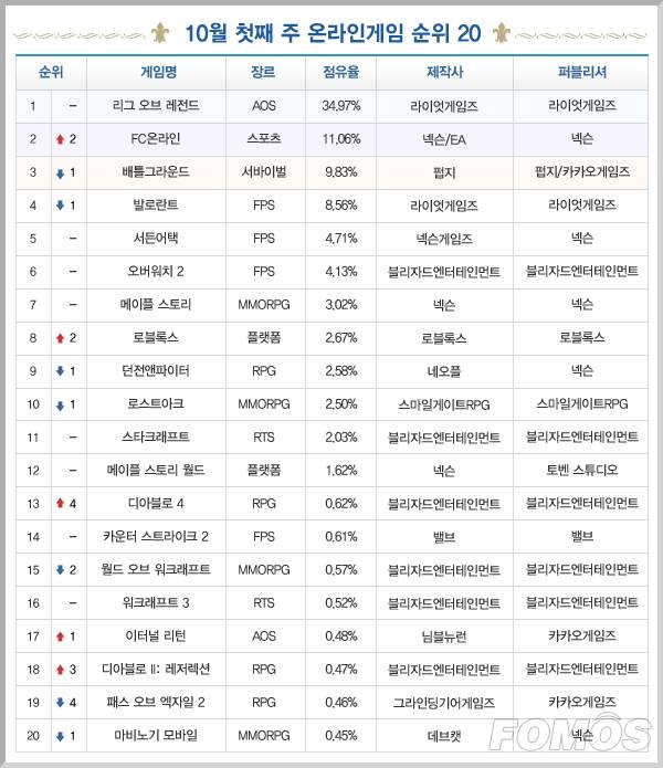 황금연휴가 시작된 10월 첫째 주 온라인 게임 이용시간 순위에선 'FC온라인'과 '디아블로' 시리즈가 인기몰이했다.