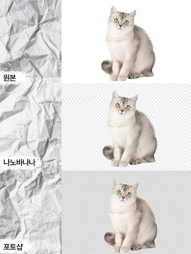 비슷해 보이지만 차이가 있다. 컴퓨터에서 이미지를 작업할 때 배경을 제거하면 ‘투명함’을 눈으로 확인하기 위해 흰색과 회색의 격자 패턴이 나오는데, 나노바나나가 수정한 이미지는 그 패턴 자체를 그렸다. 중간에 찌그러진 패턴이 보이는 이유다. 다만 흰색 배경에서 고양이를 분리하는 작업은 잘 수행했다.
